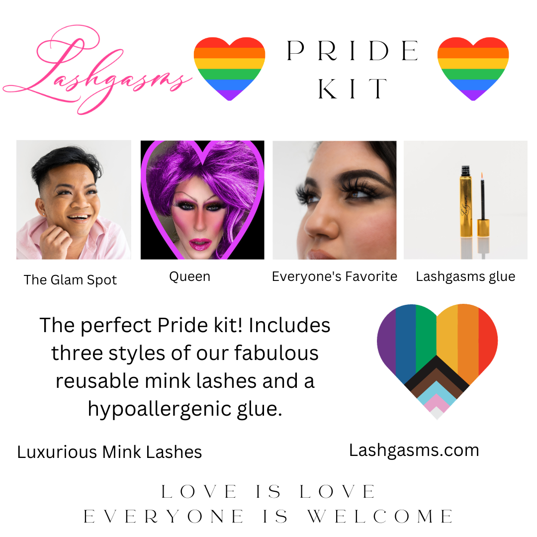 Whether you're attending a pride parade, a glamorous event, or simply want to embrace your authentic self, the Pride Kit with Queen, Everyone's Favorite, The Glam Spot mink lashes, and Lashgasms hypoallergenic glue is your ultimate companion. Get ready to celebrate individuality, make a statement, and exude confidence with this extraordinary collection. Unleash your inner diva and let your true colors shine!